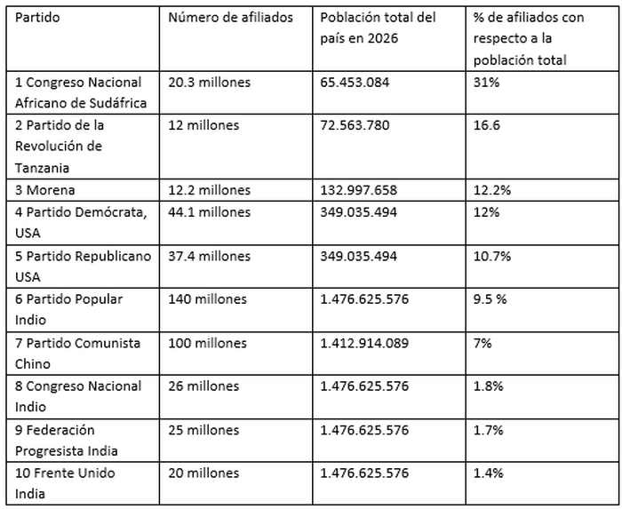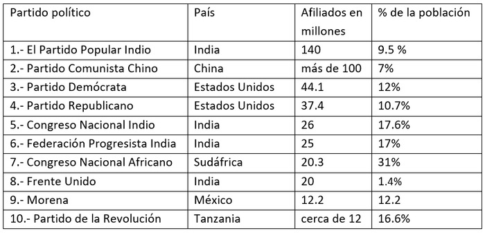 Si tomamos en cuenta sólo el número de afiliados las cifras colocan al partido mexicano MORENA en noveno lugar en una liga dominada por gigantes internacionales. La lista se expone en la siguiente tabla: